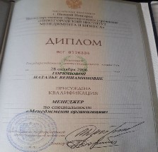 высшее: ГОУ "Нижегородский институт менеджмента и бизнеса" по специальности: "Менеджмент организации"